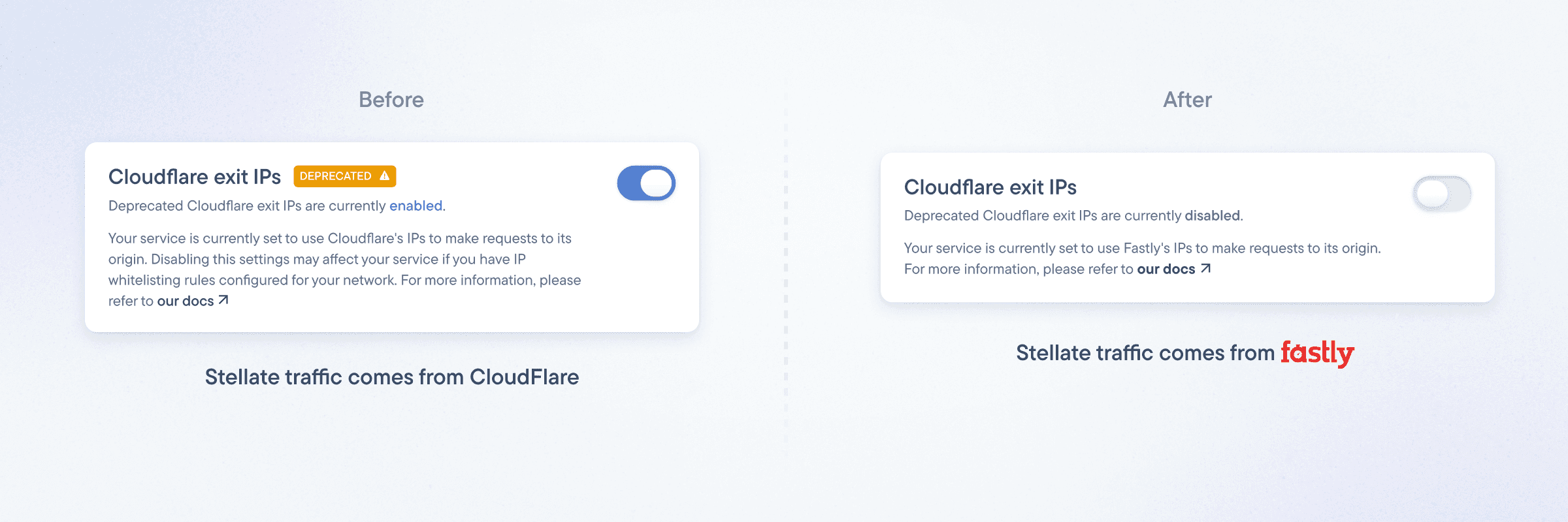 If your origin has an IP address-based allowlist/whitelist, that allowlist contains Cloudflare’s IP addresses. After November 1st, requests to your origin will come from Fastly’s infrastructure instead, so you must update your allowlist to include the new IP addresses. You can read more about how to do this in our documentation.