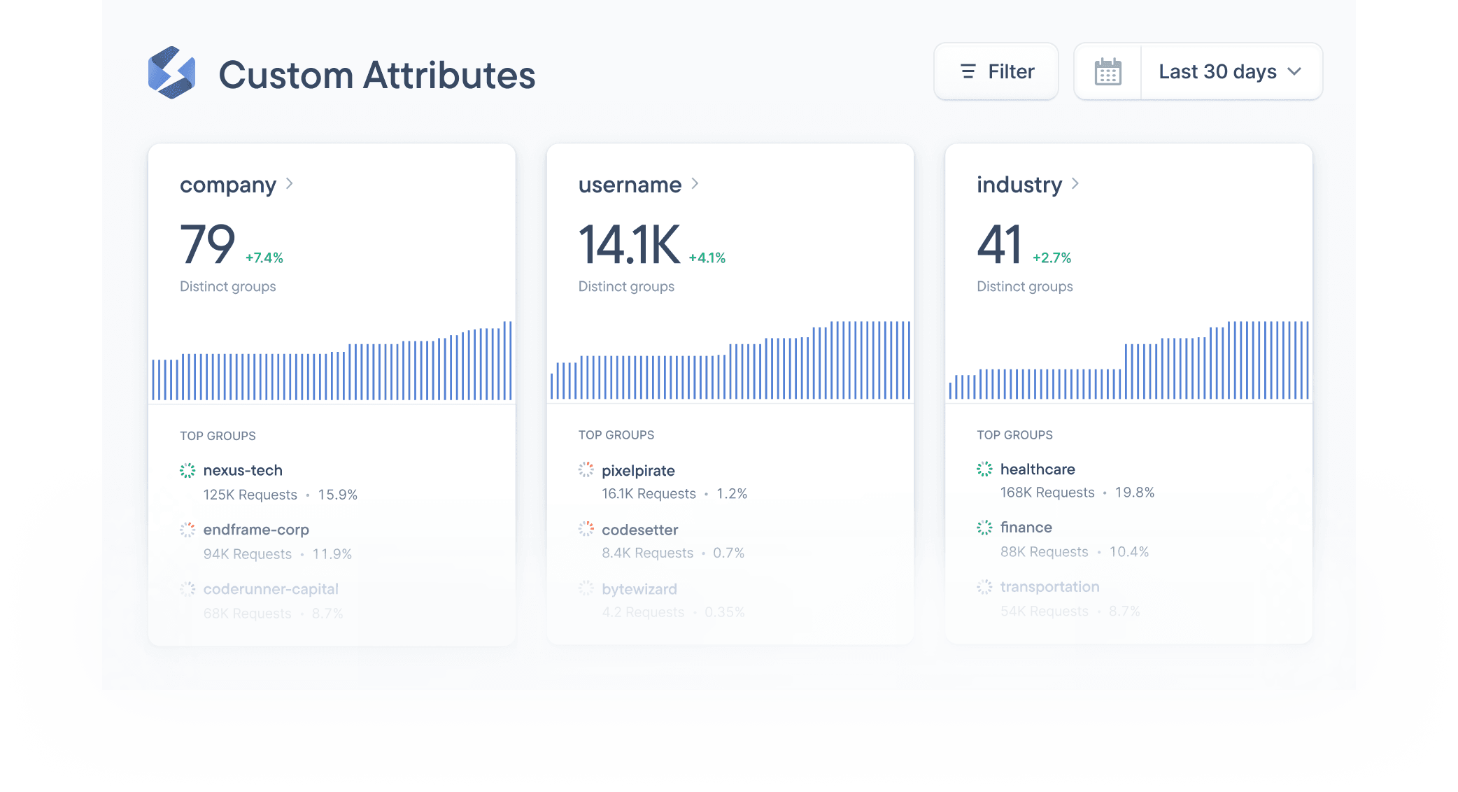 Custom Attributes are particularly valuable for services that power multi-tenant applications. By storing tenant identifiers as Custom Attribute, you can obtain metrics specific to each individual tenant. Another great use-case is storing user identifiers as Custom Attribute, allowing you to debug individual user journeys based on the requests they’re sending to your GraphQL API.
