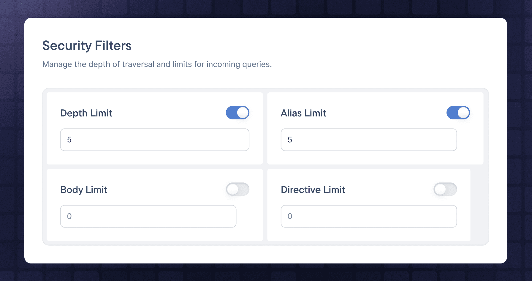 To secure the most common attack avenues, we’re introducing controls for directives limits, alias count, query size, and suggestion masking. The request validation occurs in our edge service, meaning malicious requests never reach your network. Learn More.