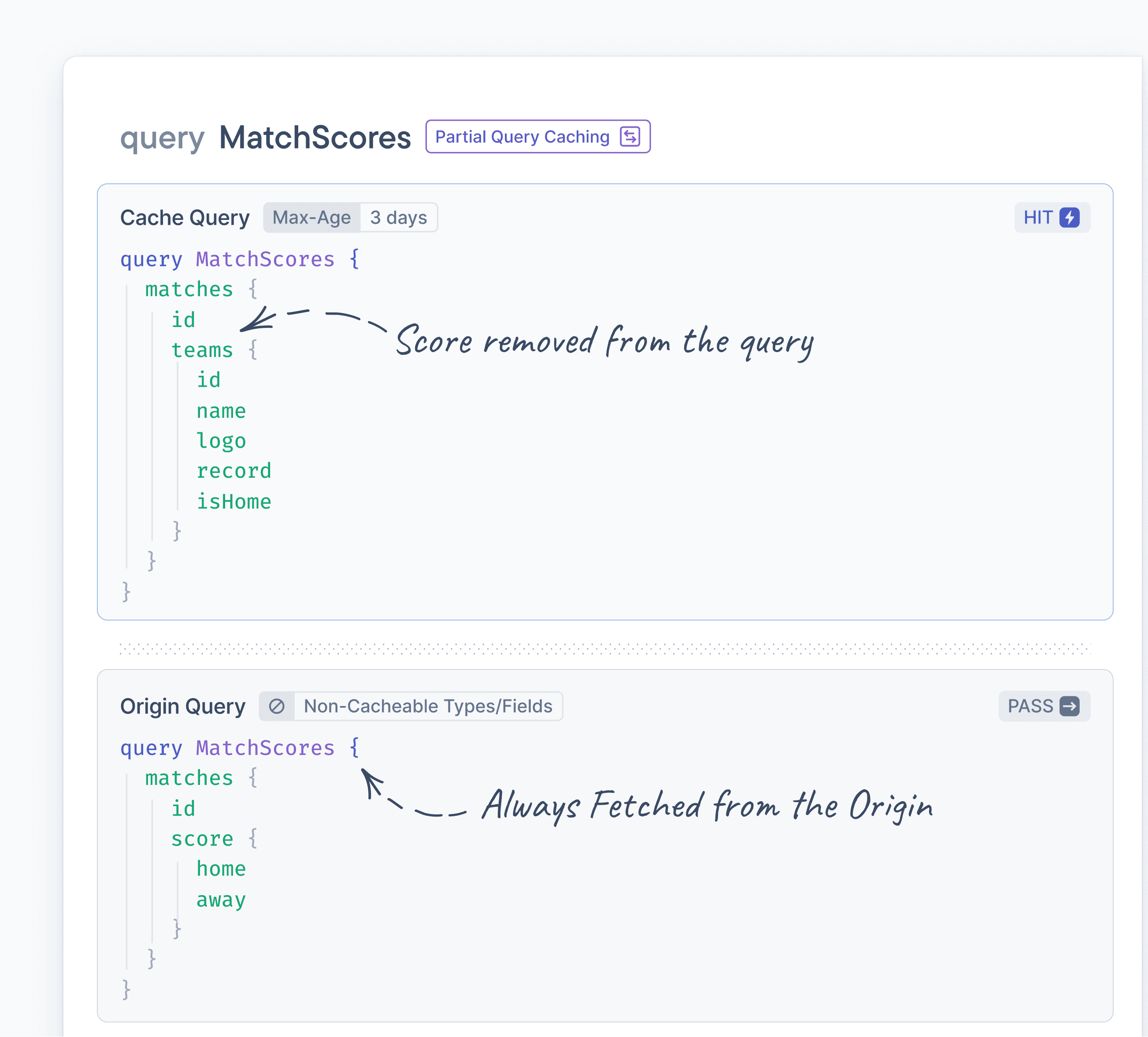 Whenever someone navigates between pages, we’d prefer to only fetch data from the origin that’s possibly changed (the score), while pulling static data (everything else) from the cache. Historically, this single field - the score - would render the entire query non-cacheable. Except with Partial Query Caching.