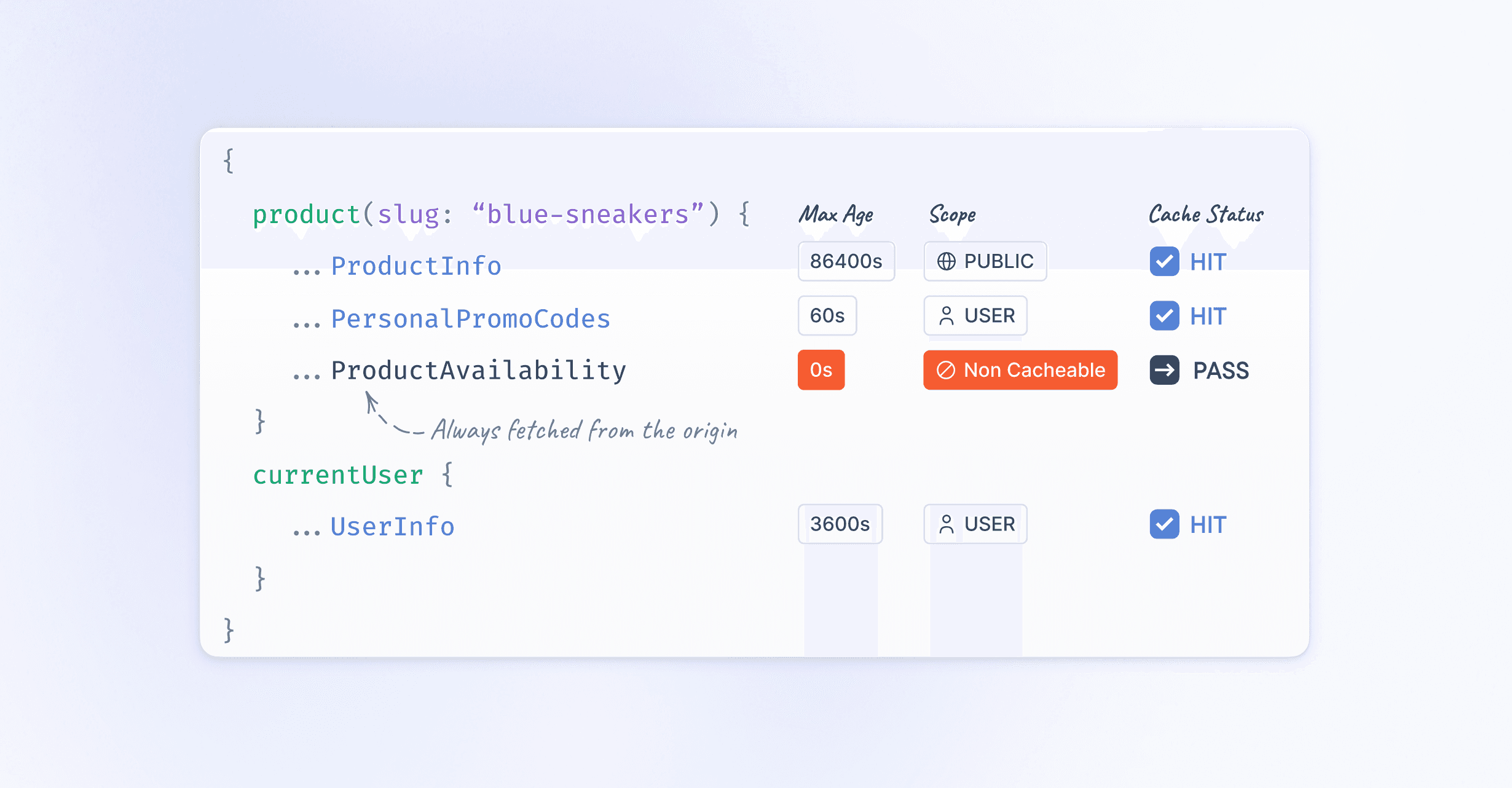 {product(slug: "blue-sneakers") {...ProductInfo # maxAge: 86400s, scope: PUBLIC...PersonalPromoCodes # maxAge: 60s, scope: USER...ProductAvailability # nonCacheable ⚠️}currentUser {...UserInfo # maxAge: 3600s, scope: USER}}