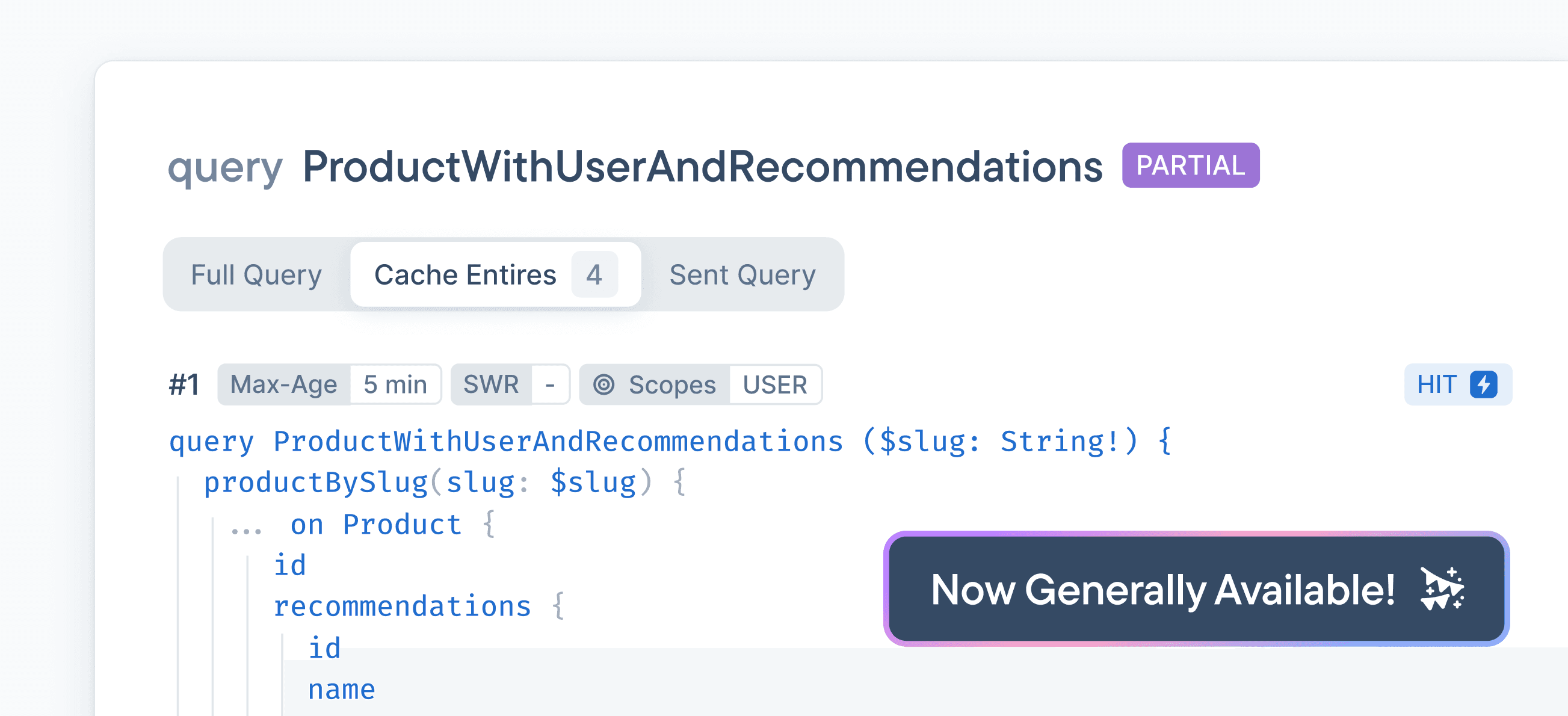 In October we released Partial Query Caching (PQC), which we believe is one of the most exciting recent additions to the GraphQL ecosystem. As we discussed previously, maximizing cache effectiveness in GraphQL is notoriously difficult. But, as engineers, by making intentional trade-offs and assumptions, we were confident we could optimize cache effectiveness safely - and we have. That's why today we're excited to announce that Partial Query Caching is generally available.